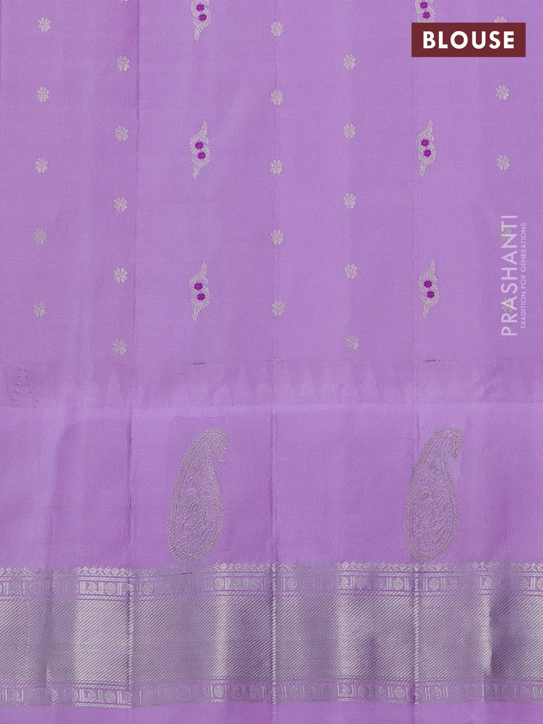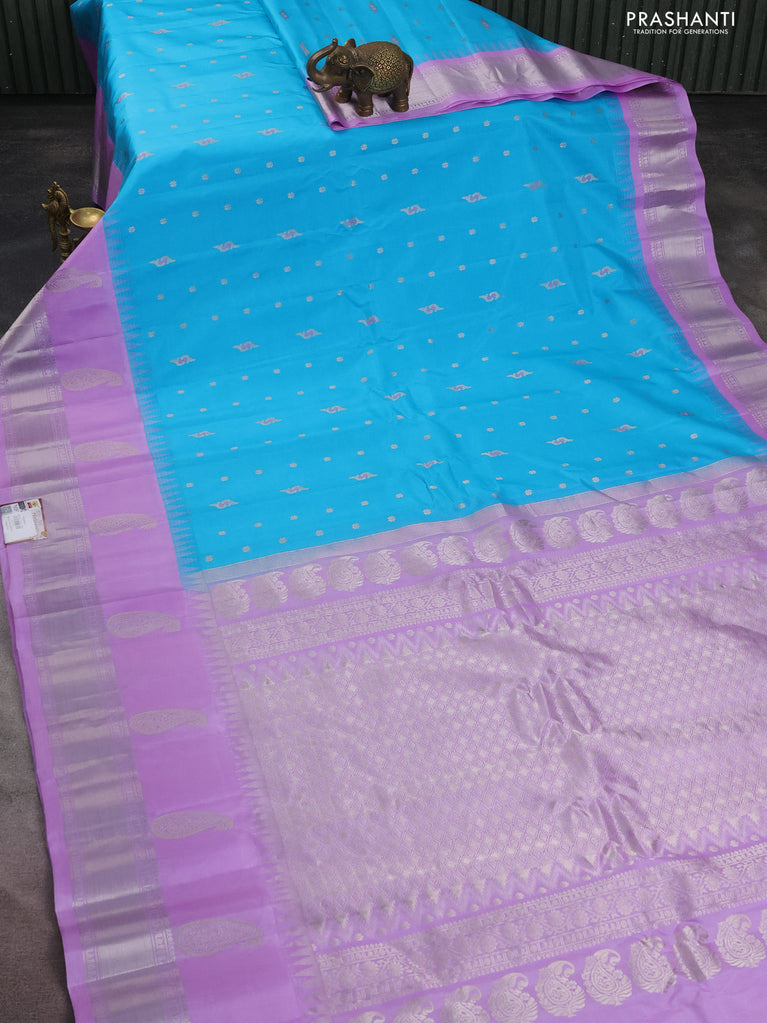 Pure gadwal silk saree light blue and lavender with allover silver zari woven buttas and long temple design silver zari woven border