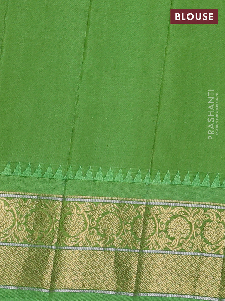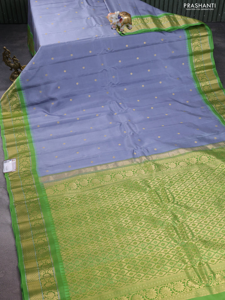 Pure gadwal silk saree grey and light green with zari woven buttas and temple design zari woven korvai border