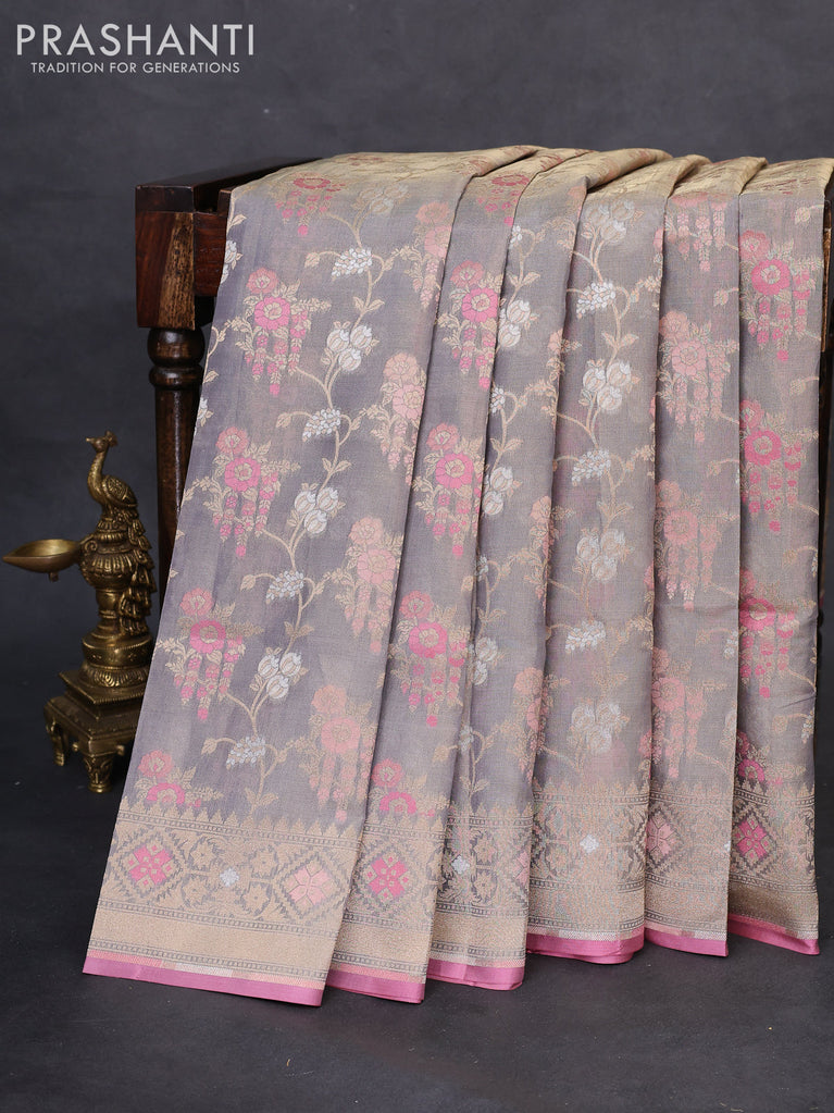 Banarasi tissue silk saree pastel grey and pink with allover thread & zari woven floral weaves and zari woven border