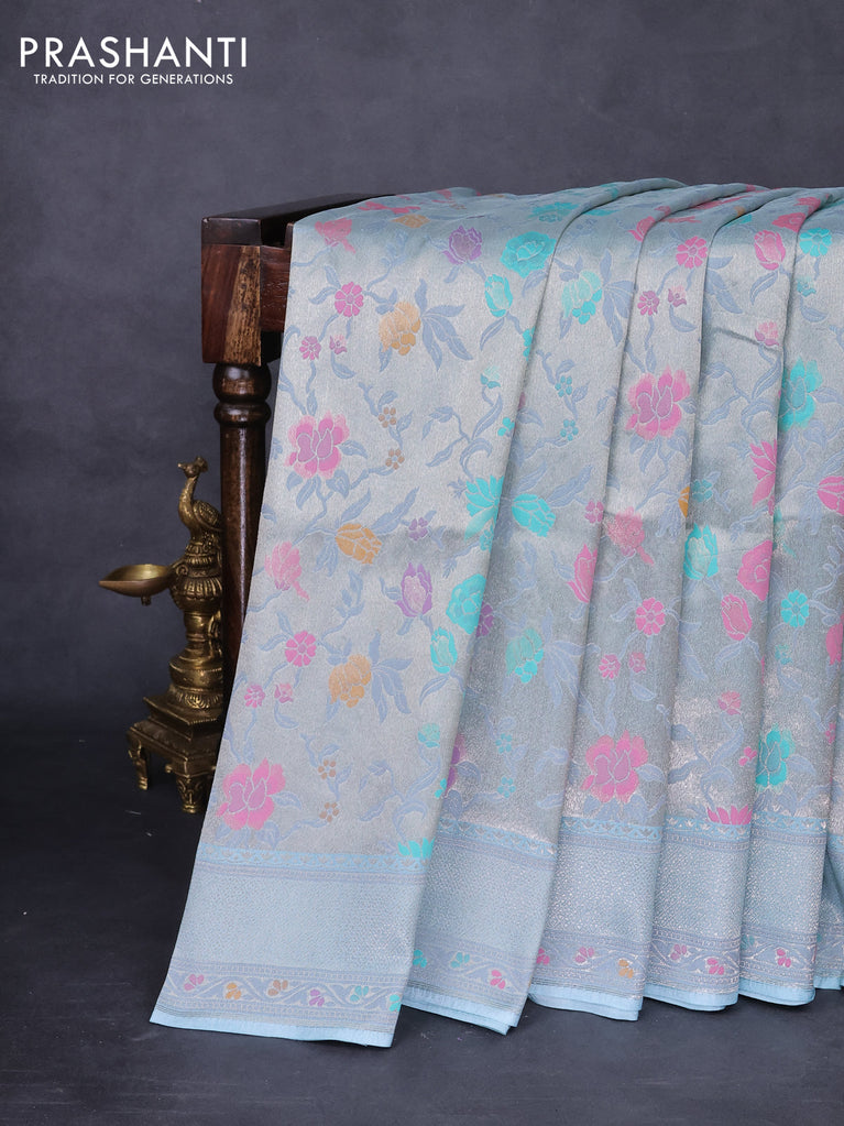 Banarasi tissue silk saree light blue with allover thread woven floral weaves and silver zari woven border