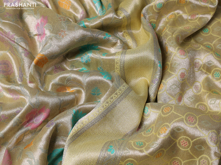 Banarasi tissue silk saree pale yellow with allover thread woven floral weaves and silver zari woven border