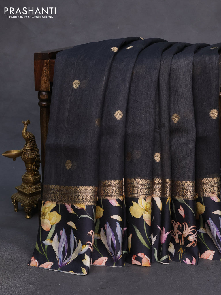 Banarasi tussar silk saree black with zari woven buttas and zari woven floral digital printed border