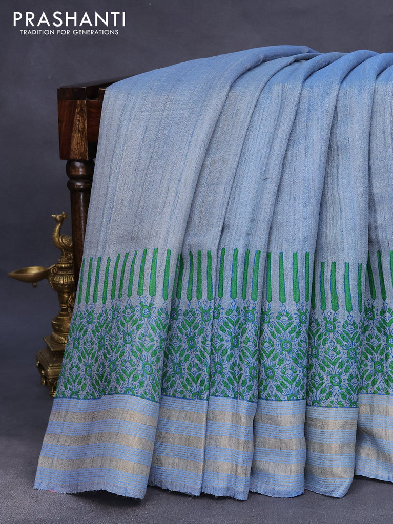 Banarasi tussar silk saree blue shade with plain body and printed pallu