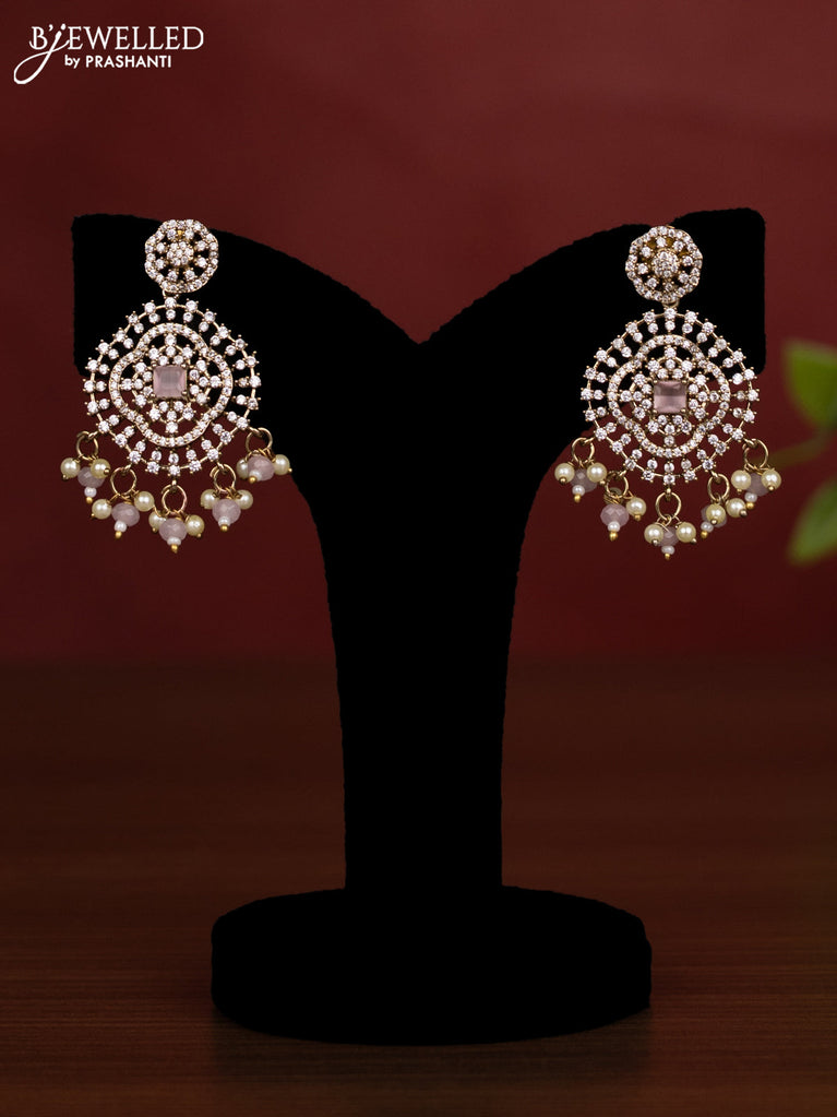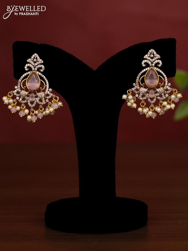 Beaded triple layer baby pink necklace peacock design with kundan & cz stones and pearl & beads hanging in victorian finish