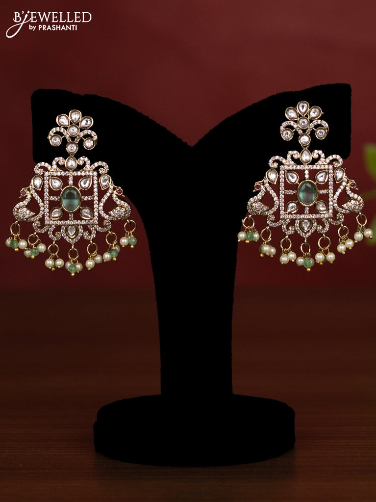 Beaded multilayer mint green necklace with kundan & cz stones and pearl & beads hanging in victorian finish