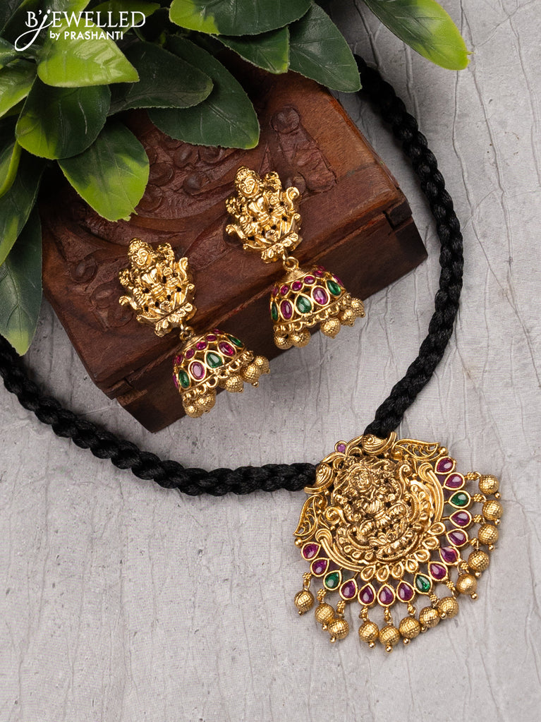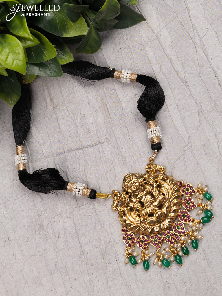 Black thread necklace with kemp stone lakshmi pendant and golden beads hangings