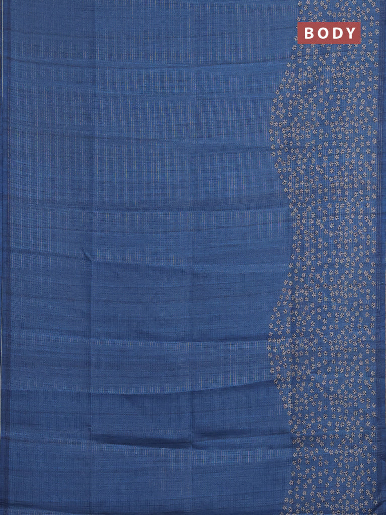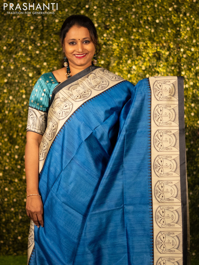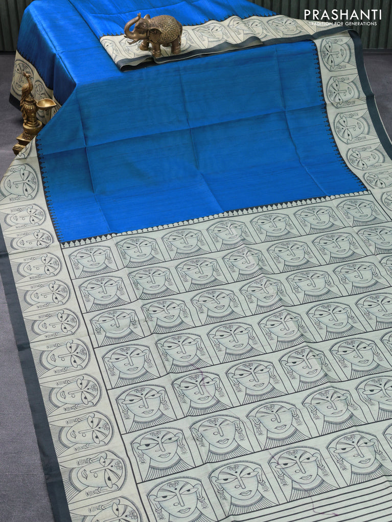 Chappa saree blue and cream with plain body and madhubani printed border