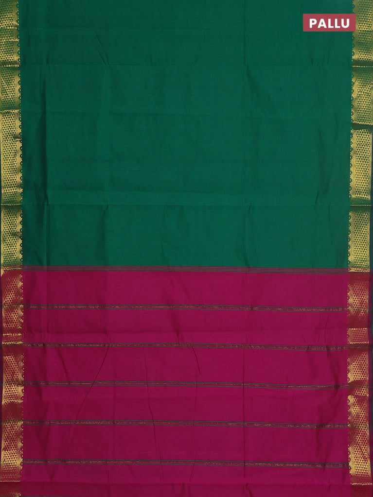 10 yards Poly cotton saree green and magenta pink with plain body and zari woven border