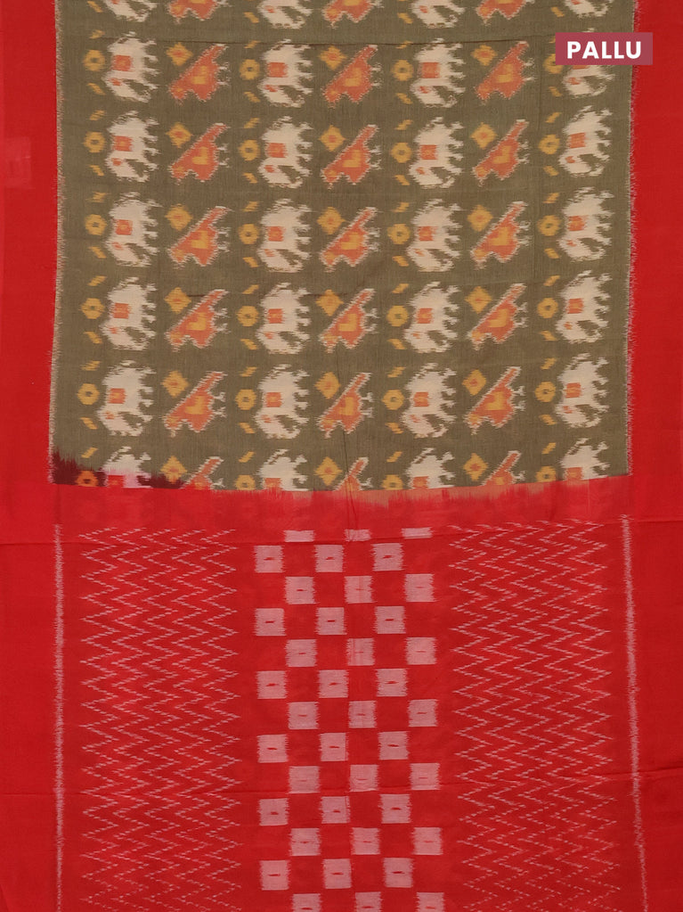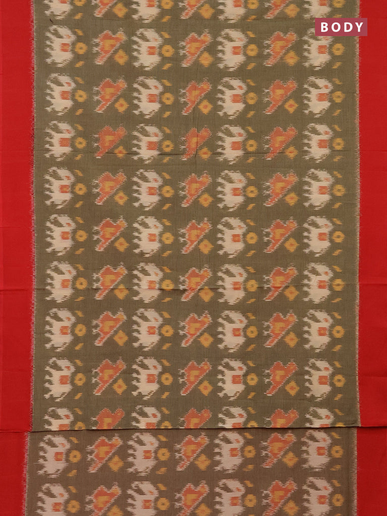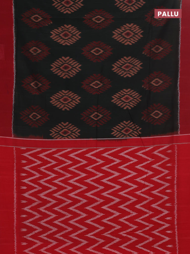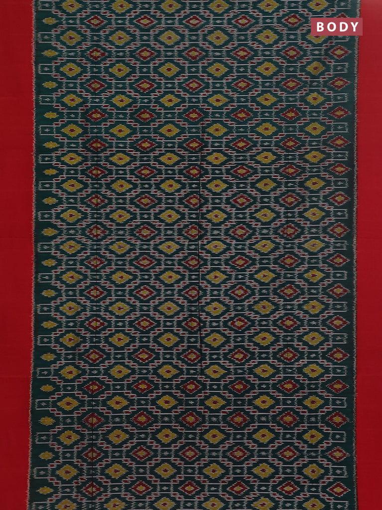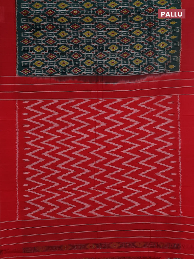 Ikat cotton saree dark green and red with allover ikat weaves and simple border