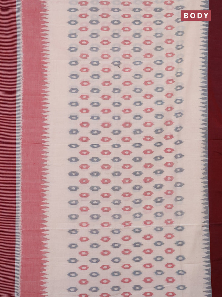 Ikat cotton saree cream and red with allover ikat butta weaves and temple design simple border