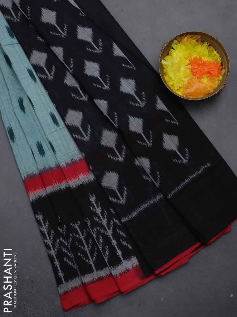 Ikat cotton saree green and black red with allover ikat butta weaves and long ikat style border