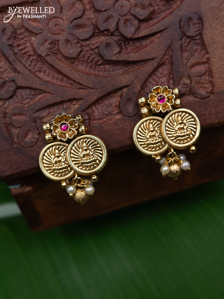 Antique earring lakshmi design with pink kemp stone and pearl & golden beads hanging