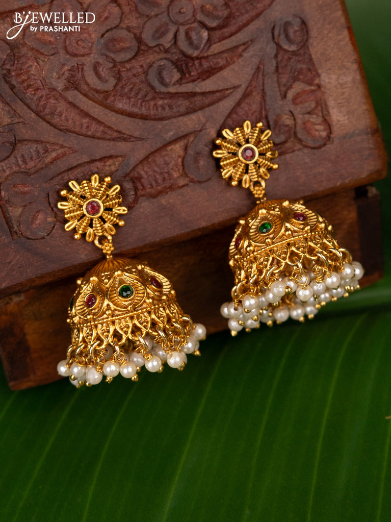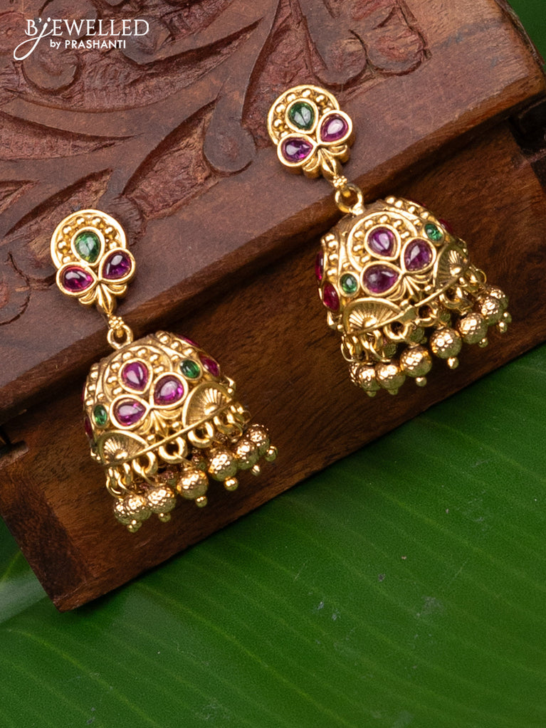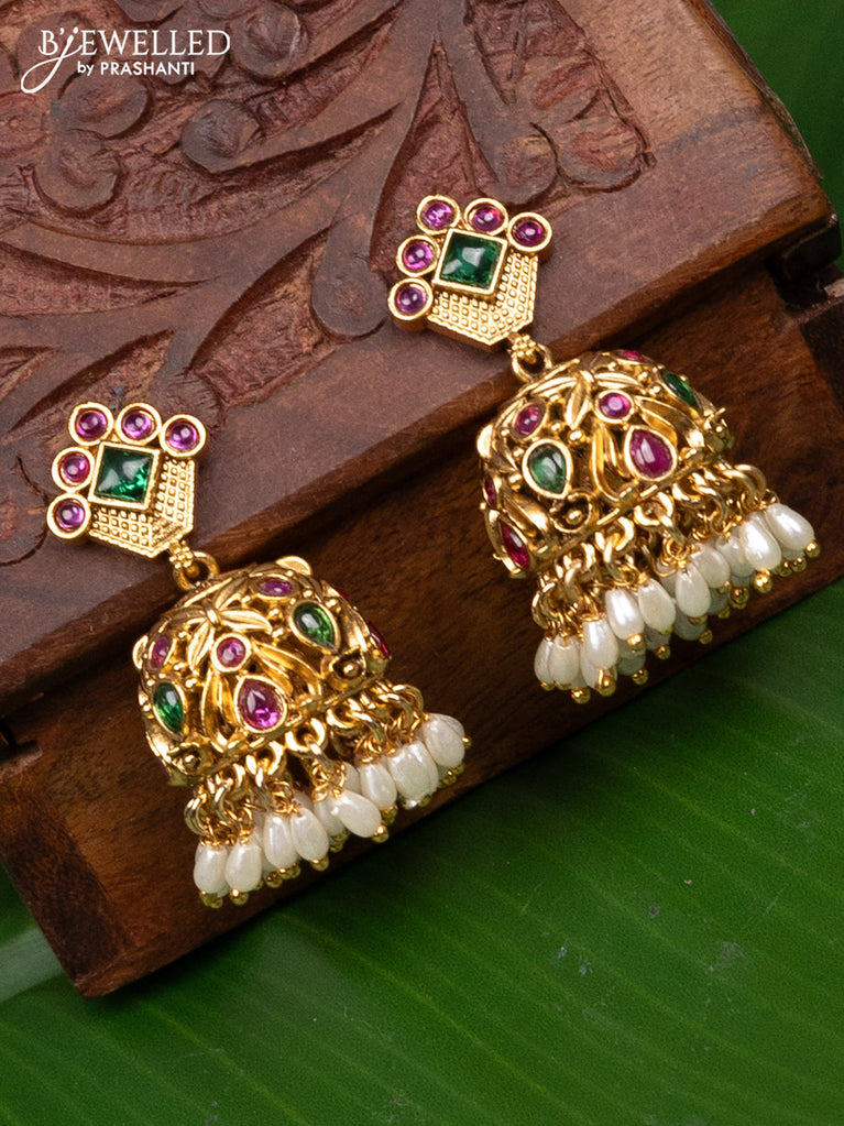 Antique jhumka with pink jadau kundan stones and pearl & beads hanging