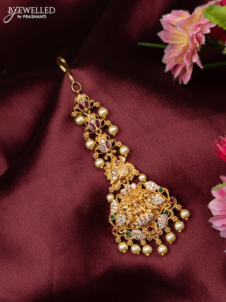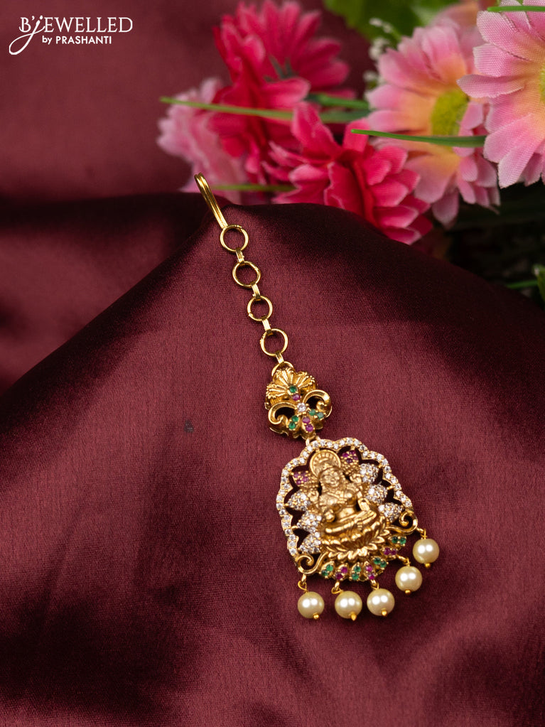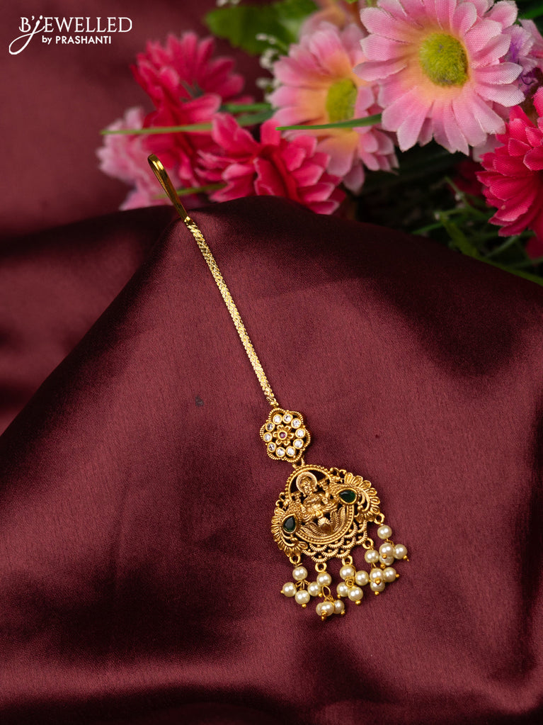 Antique maang tikka lakshmi design with kemp & cz stones and pearl hangings