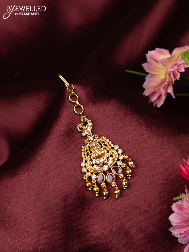 Antique maang tikka lakshmi design with pink kemp & cz stones and golden beads hangings