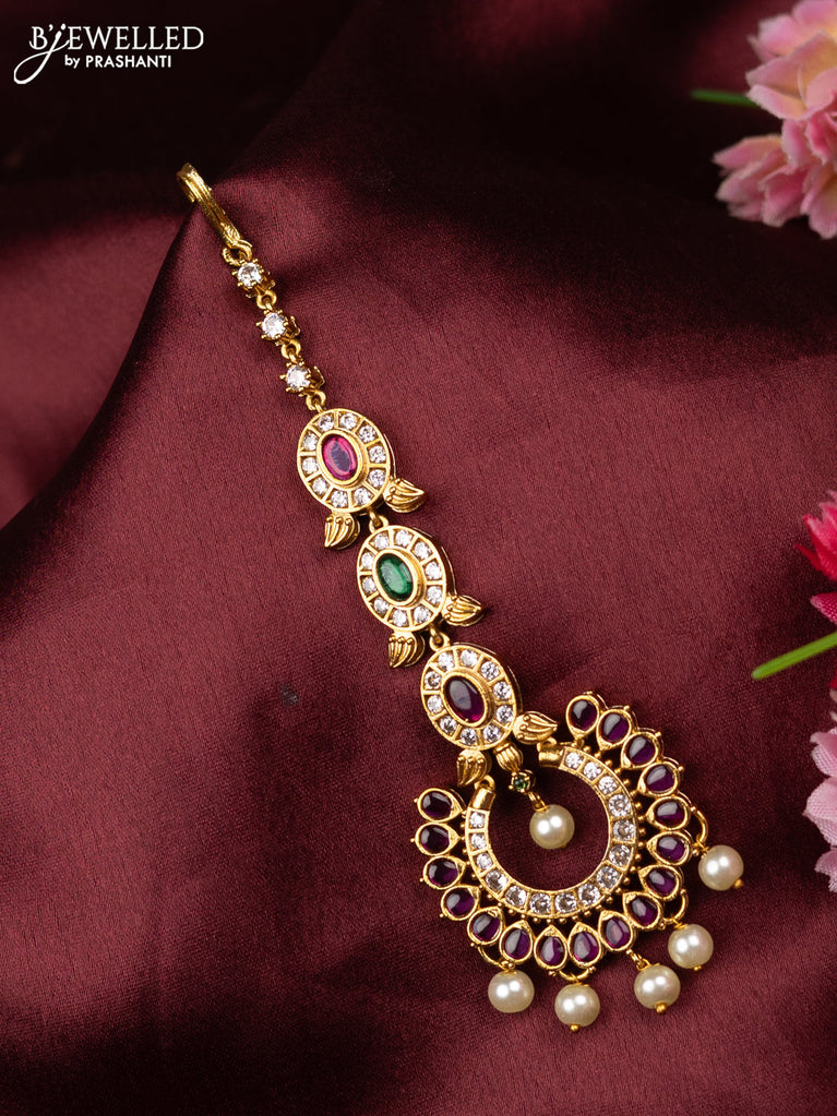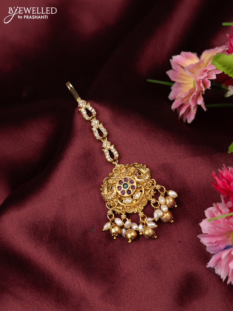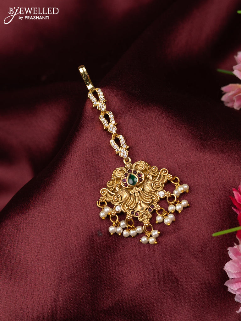Antique maang tikka with kemp & cz stones and pearl hangings