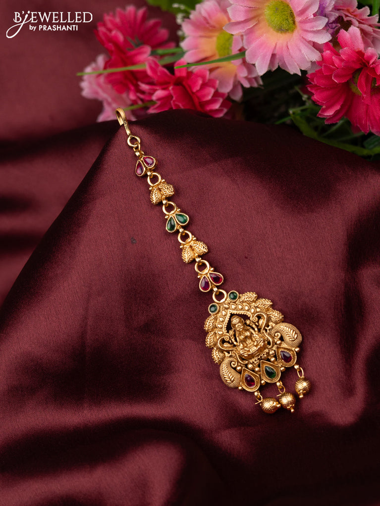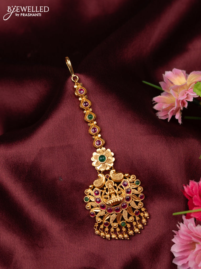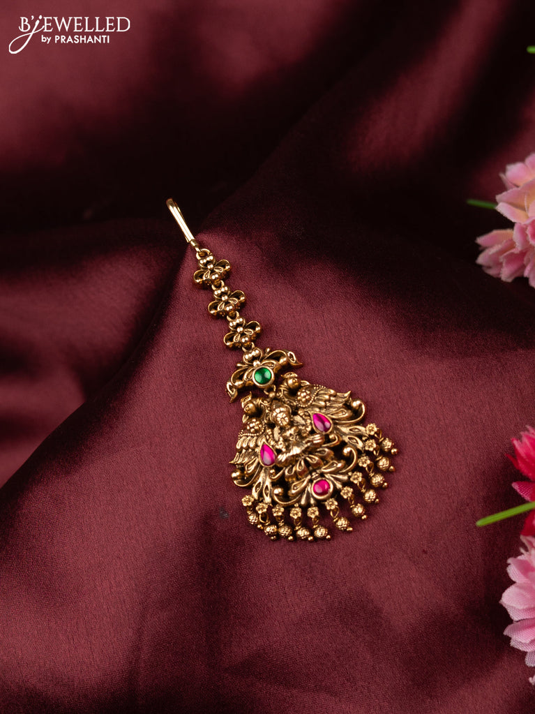 Antique maang tikka lakshmi design with kemp and golden beads hangings