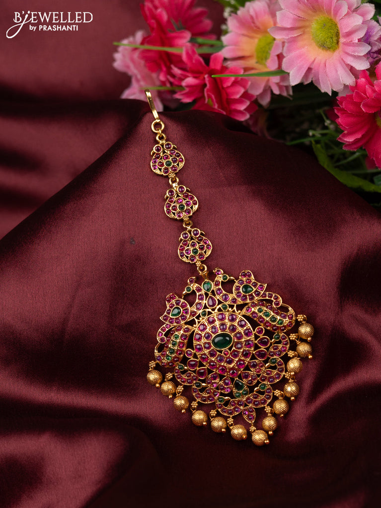 Antique maang tikka with emerald & cz stones and gold beads hangings