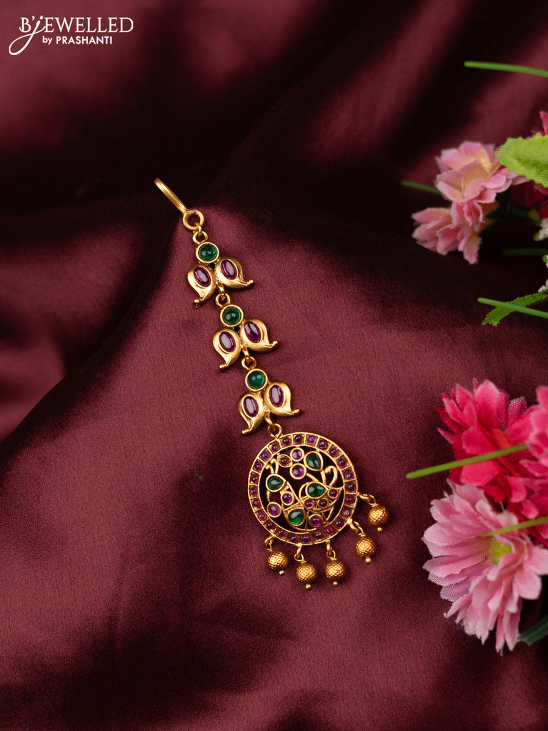 Antique maang tikka pecock design with kemp stones and golden beads hangings