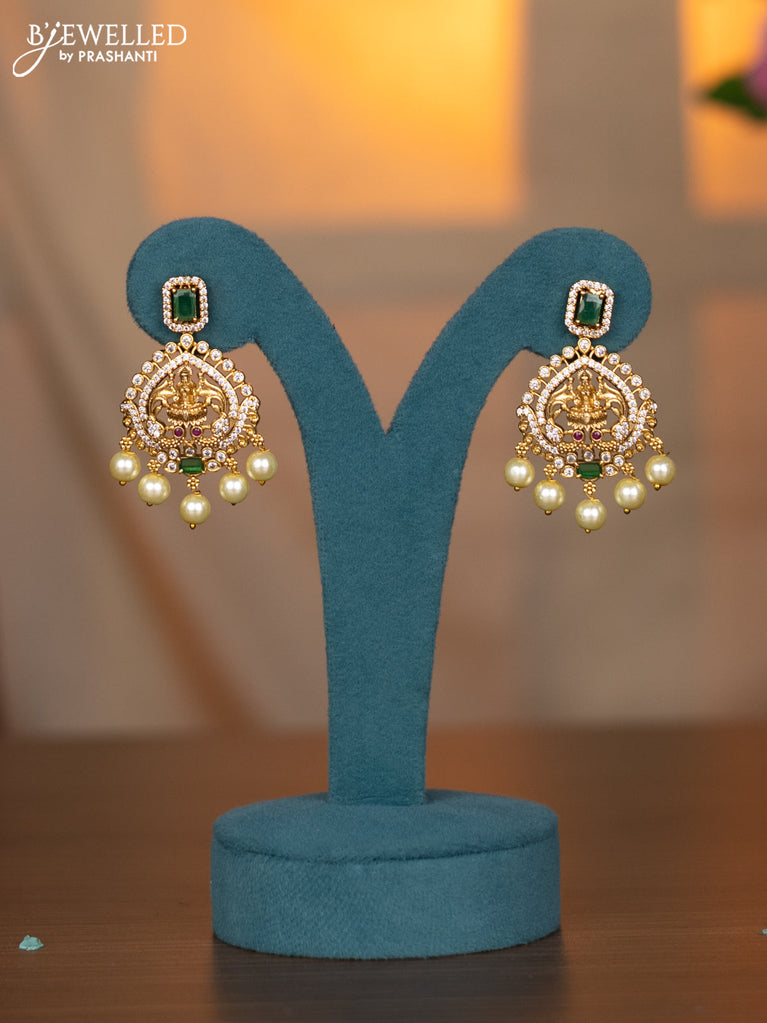Antique triple layer Necklace with green kemp & cz stones and pearl hangings