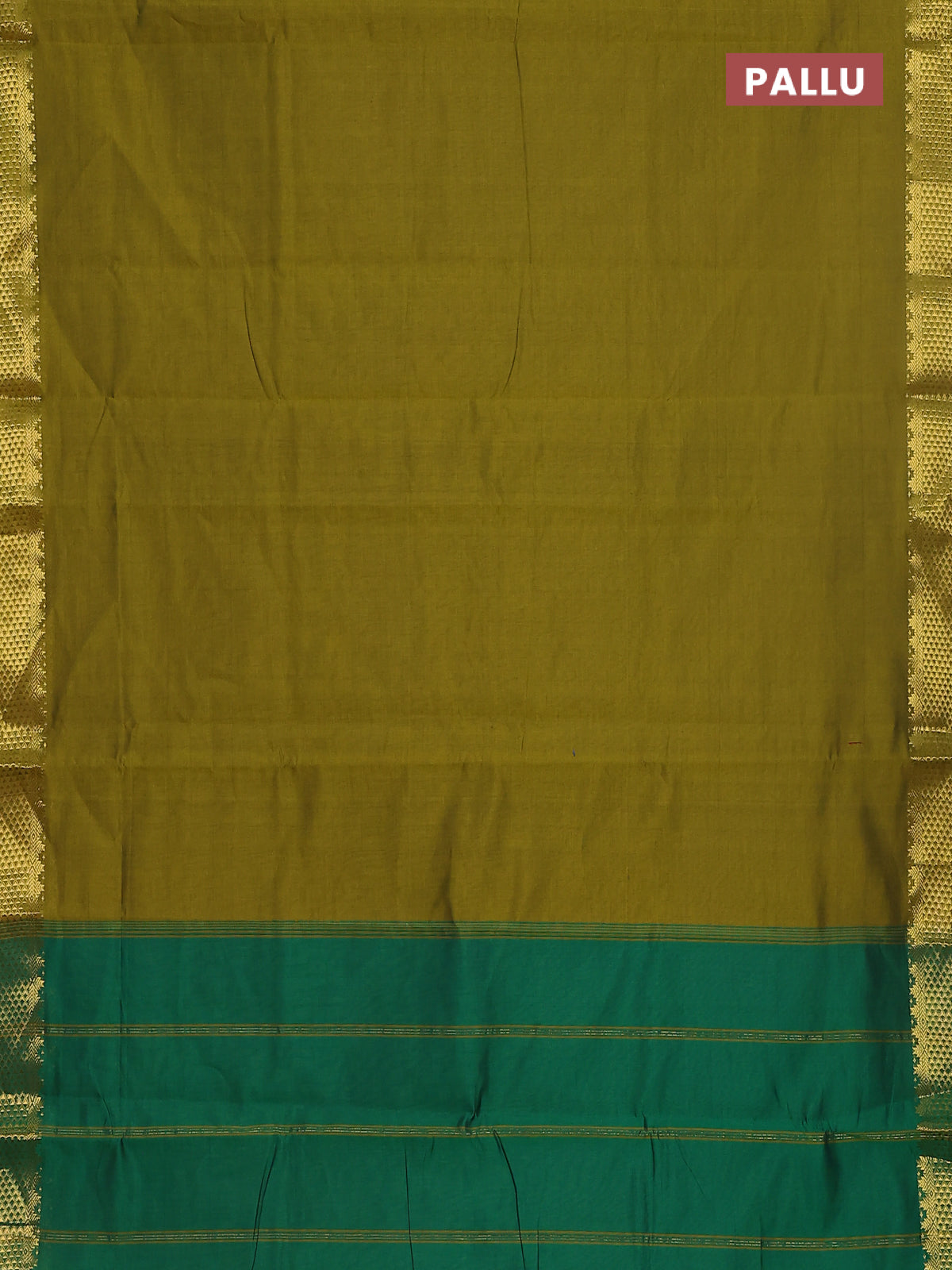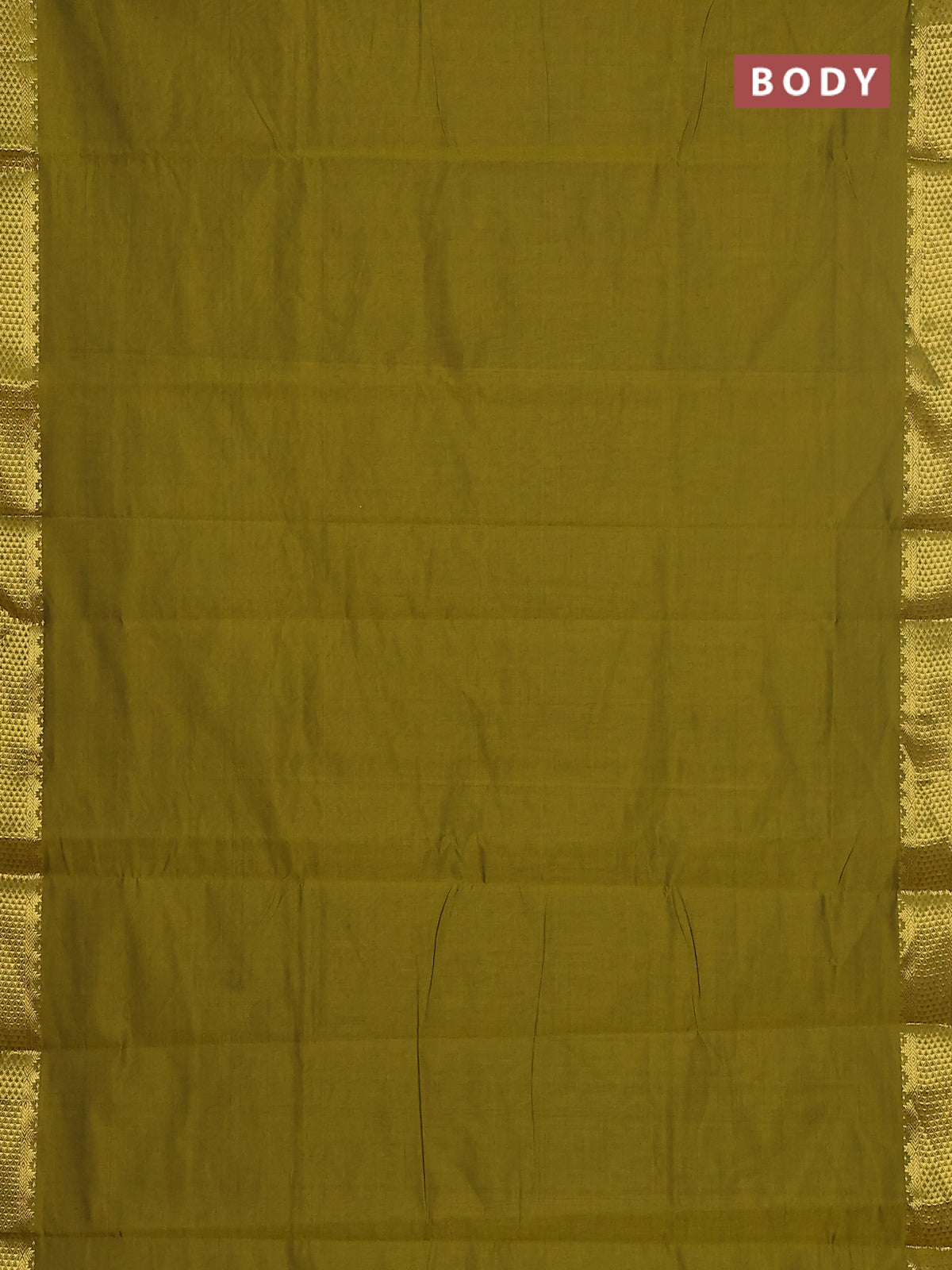 10 yards Poly cotton saree mehendi green and green with plain body and zari woven border