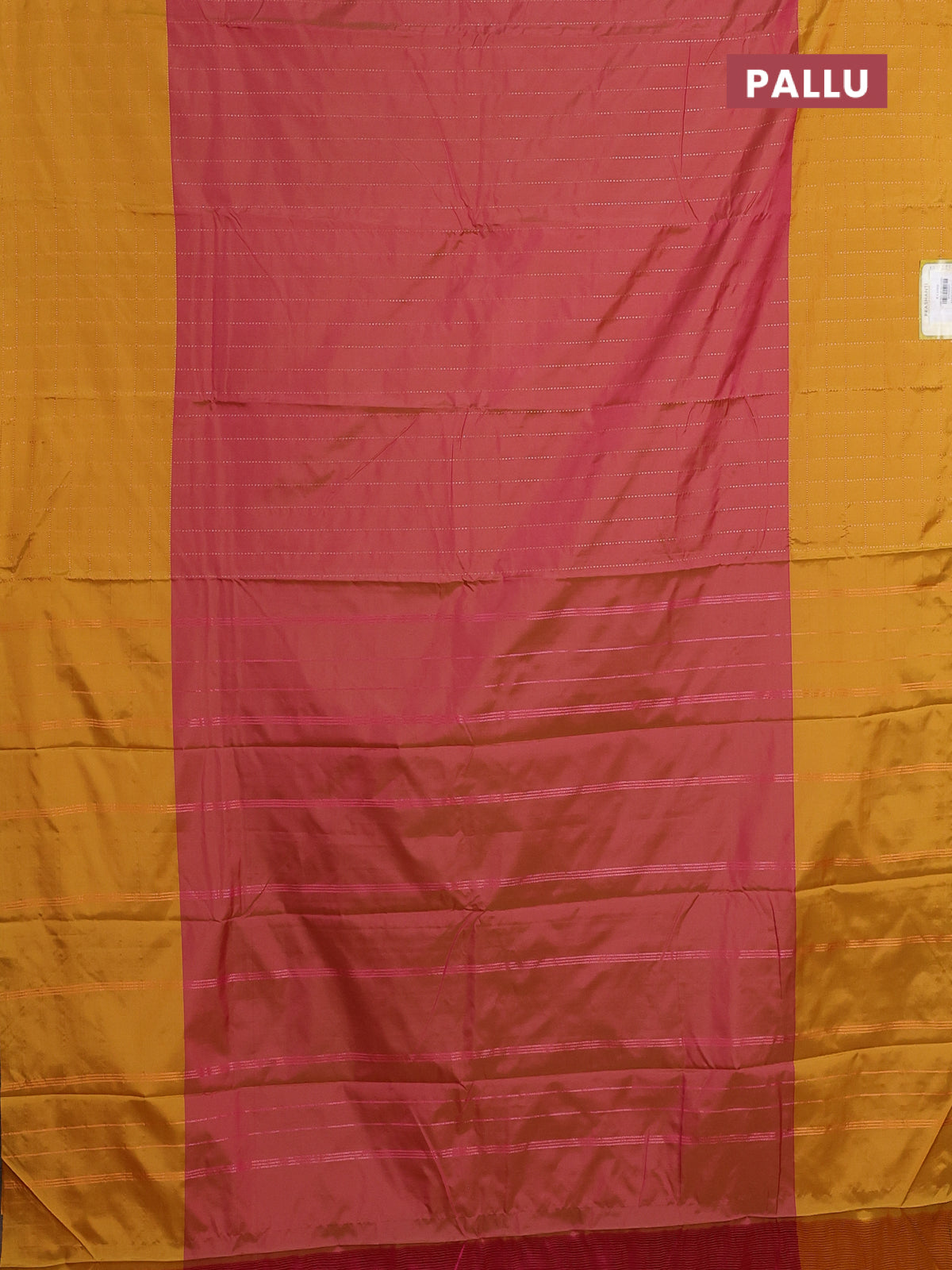 Arani semi silk saree dual shade of pink and dark mustard with allover copper zari weaves and zari checked border
