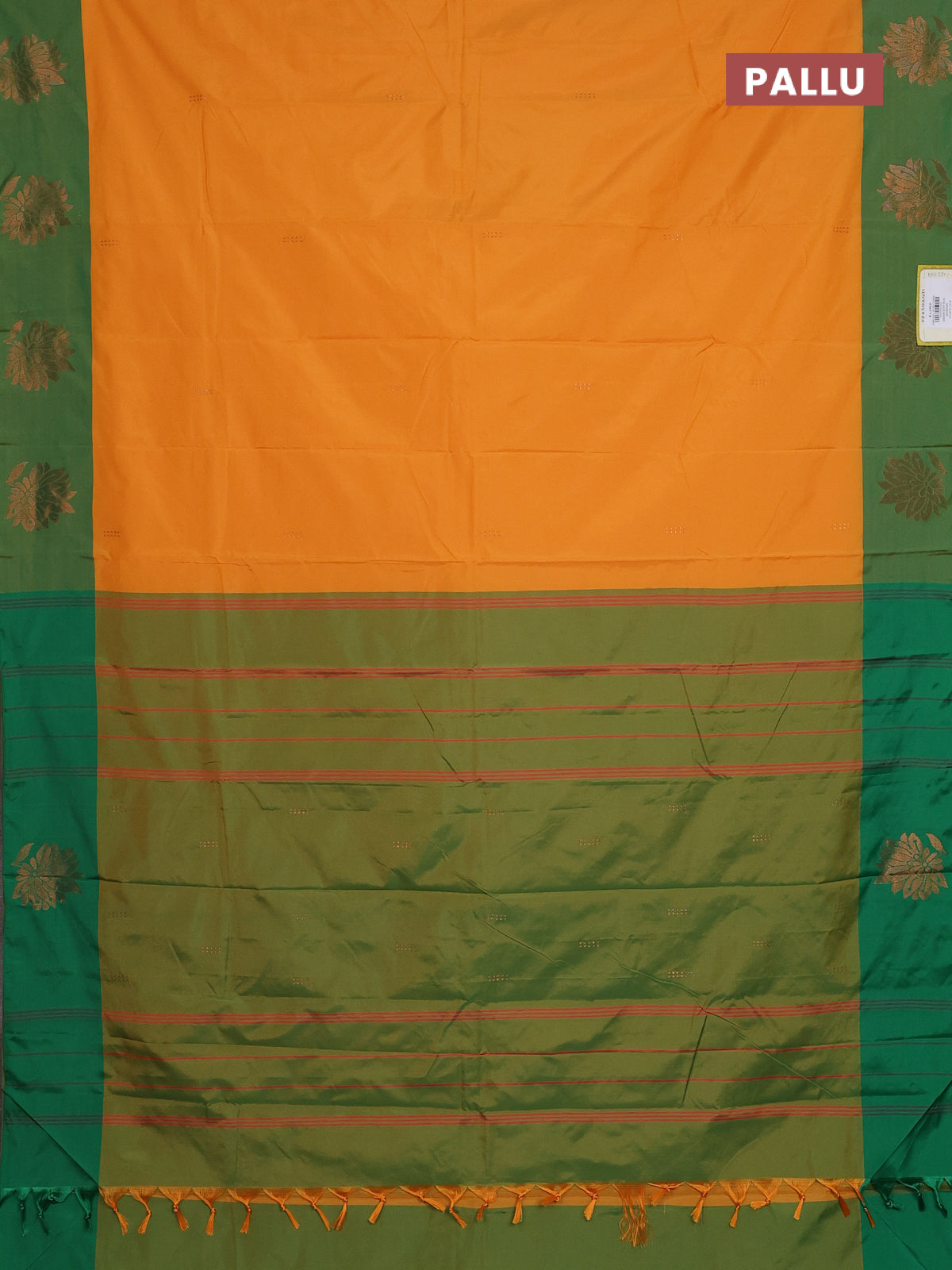 Arani semi silk saree mango yellow and dual shade of green with copper zari woven buttas and copper zari woven butta border