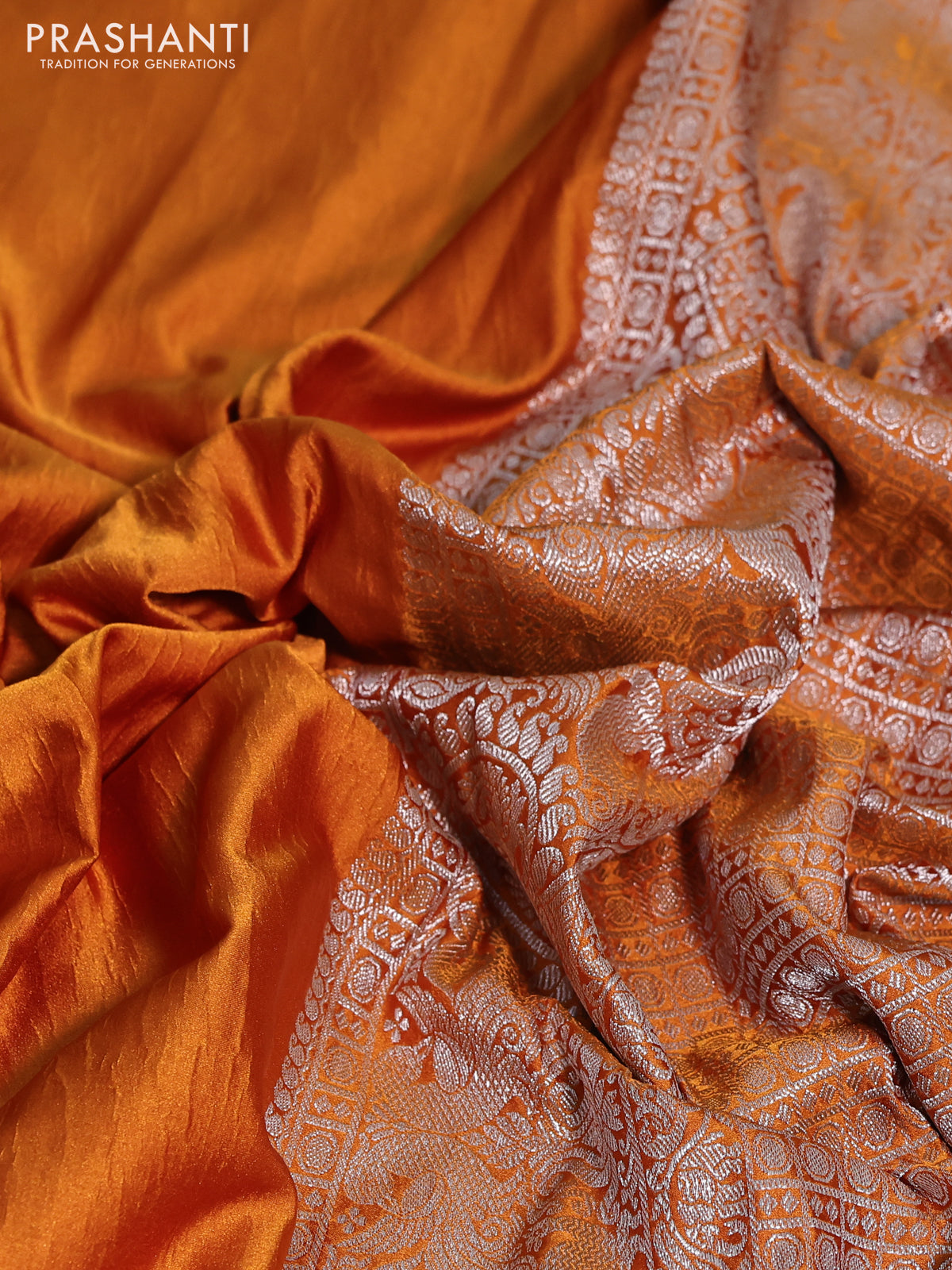 Banarasi crush crepe saree mustard yellow with plain body and silver zari woven border