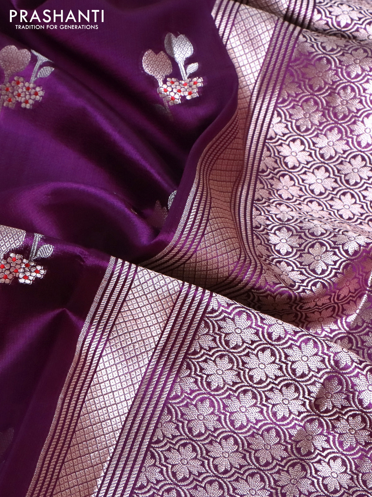 Banarasi poona silk saree purple with zari woven floral buttas and silver zari woven border