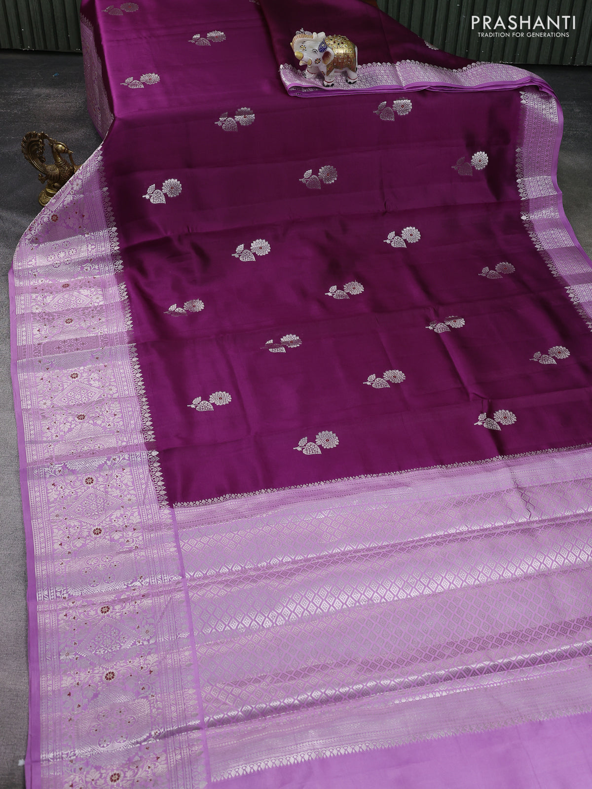 Banarasi poona silk saree wine shade and lavender with silver zari woven buttas and silver zari woven border