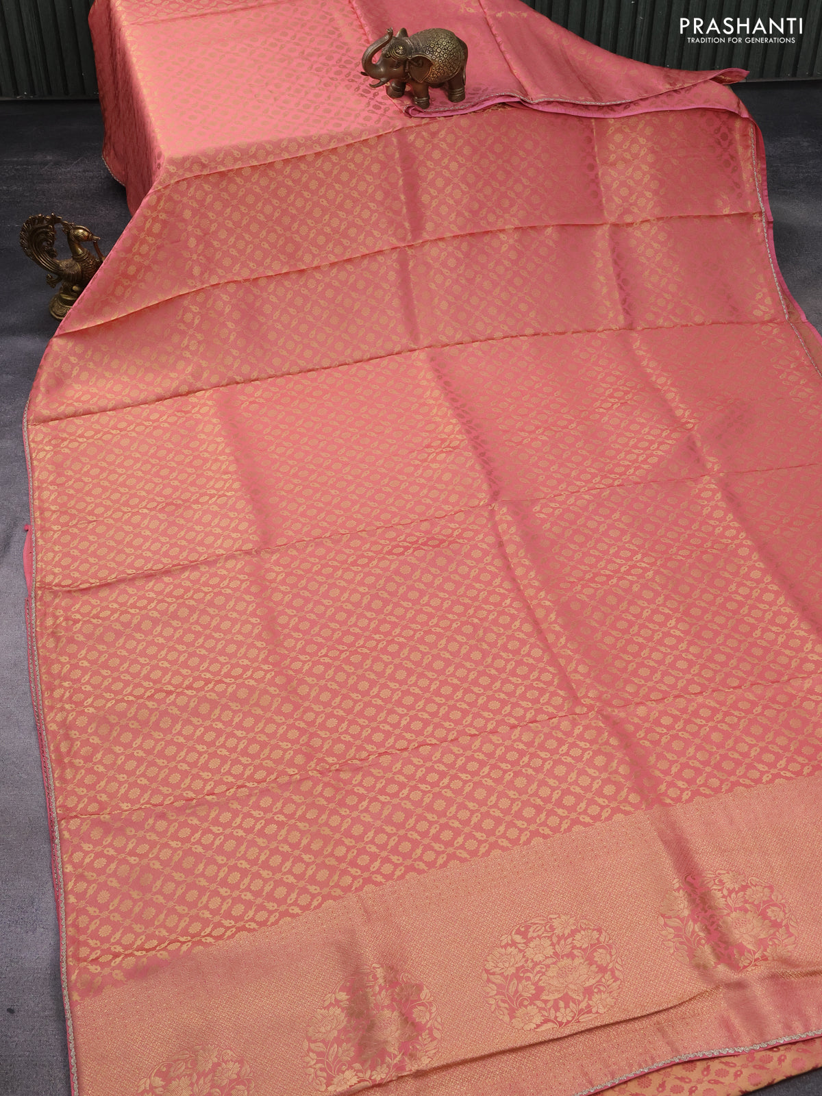 Banarasi semi crepe saree peach pink with allover zari woven brocade weaves and lace work border
