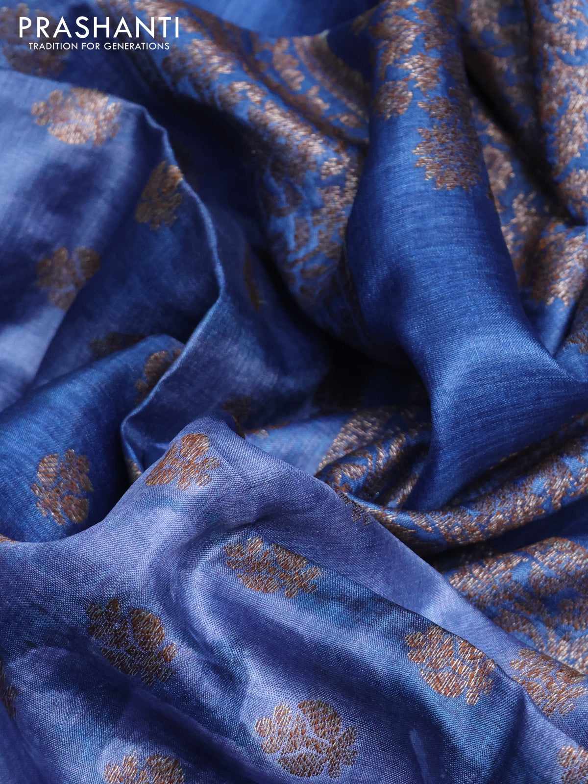Banarasi tussar silk saree blue with woven buttas & floral digital prints and piping border