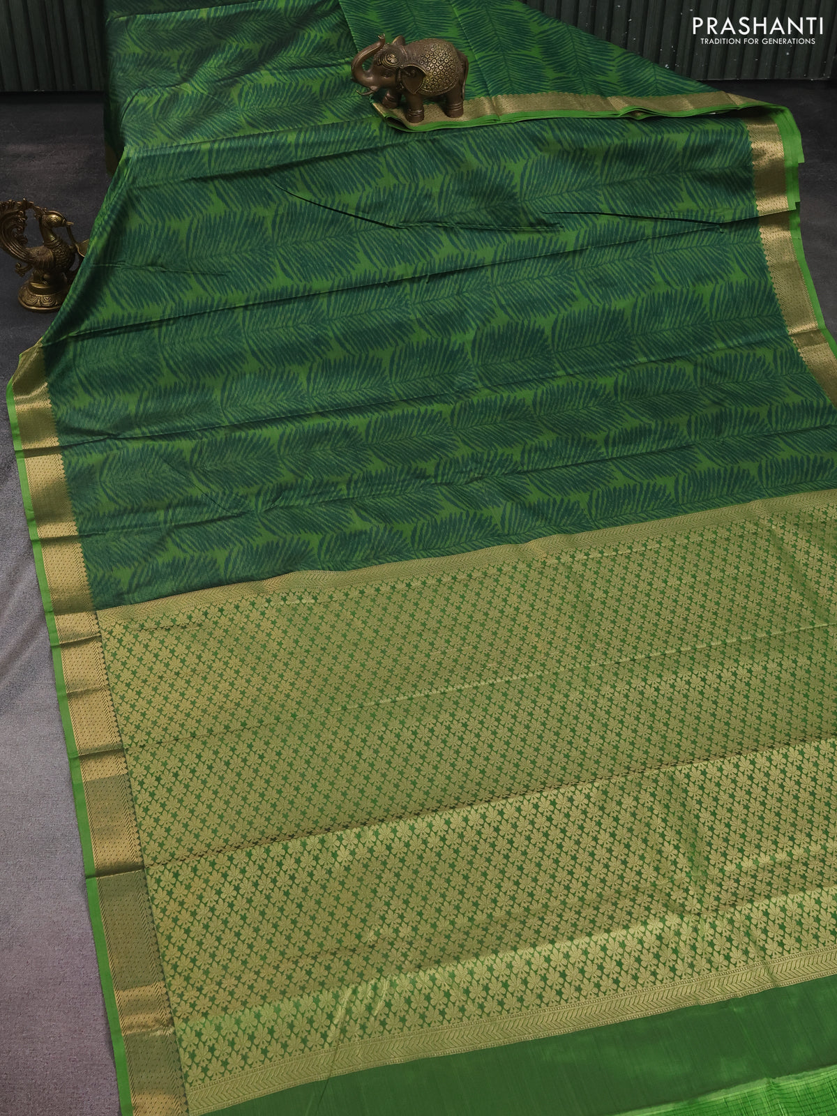 Bangalori semi silk saree light green and green with allover ikat weaves and zari woven border