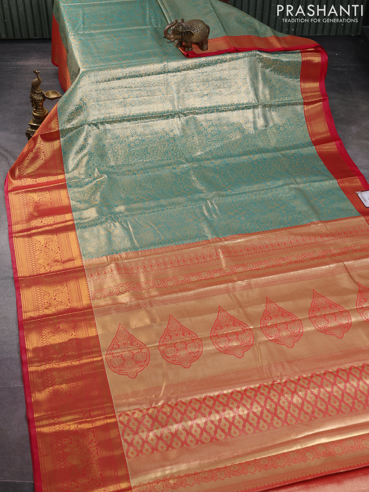 Bangalori tissue silk saree teal green and red with allover zari woven brocade weaves and long zari woven border