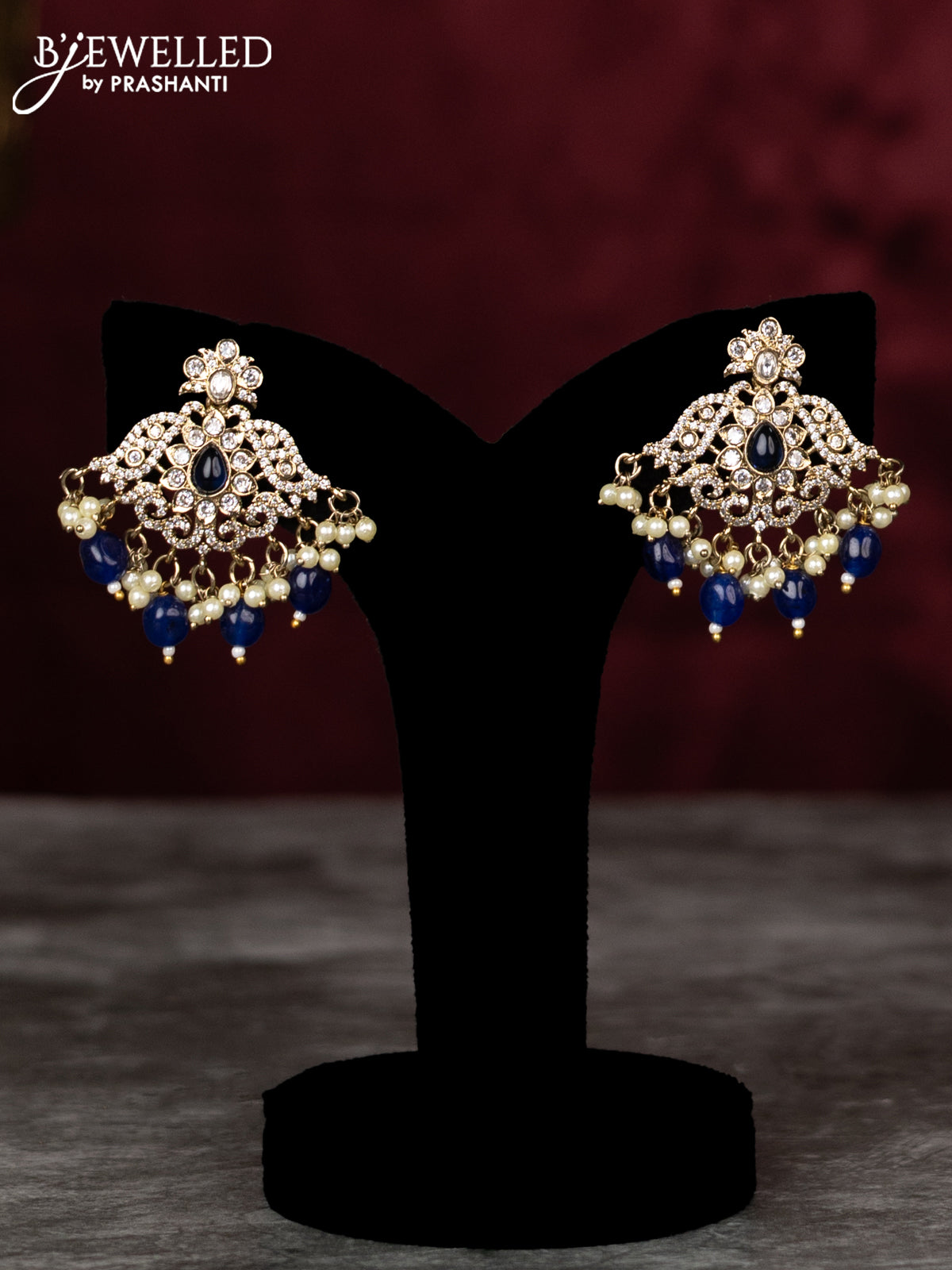 Beaded double layer blue haram peacock design with sapphire & kundan cz stones and pearl & beads hangings in victorian finish