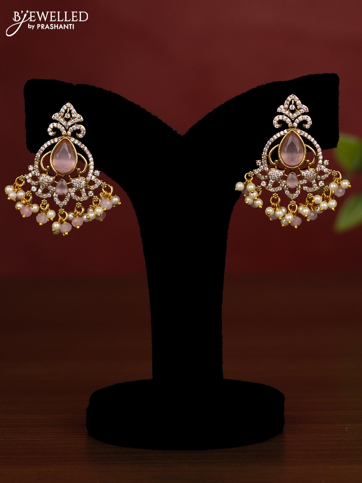Beaded triple layer baby pink necklace with cz stones and pearl & beads hanging in victorian finish