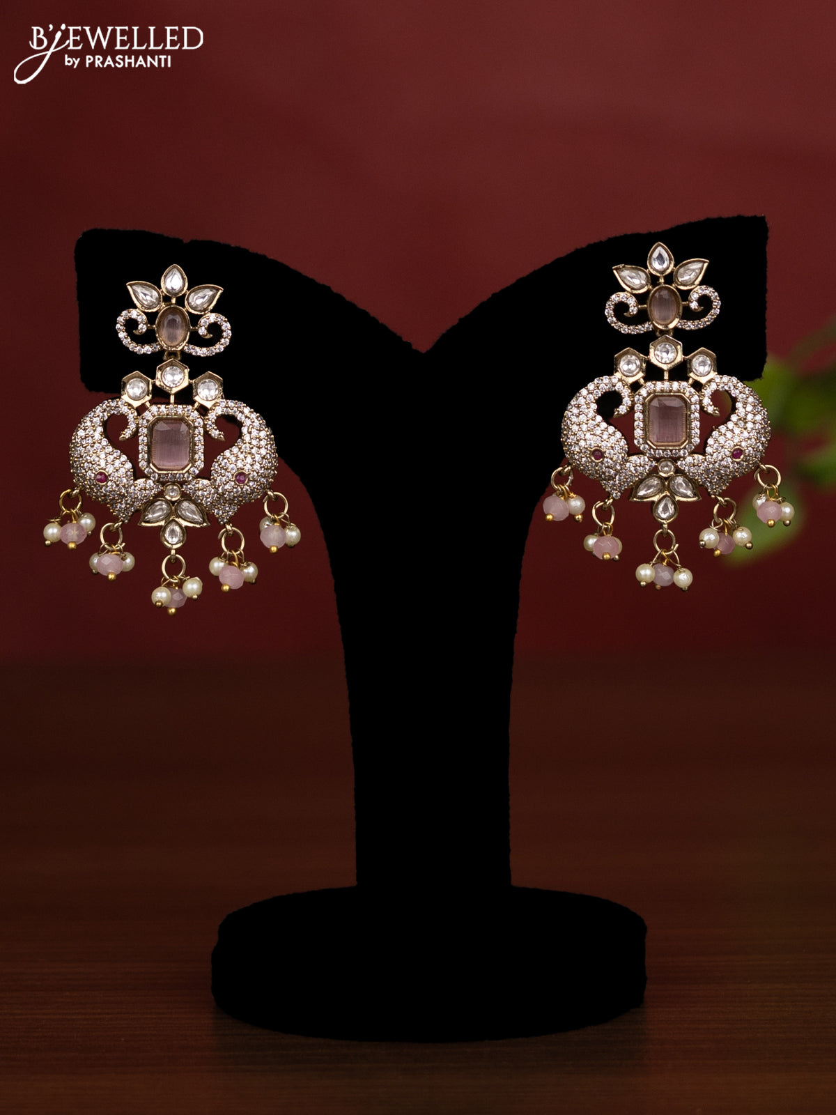 Beaded triple layer baby pink necklace with kundan & cz stones and pearl & beads hanging in victorian finish