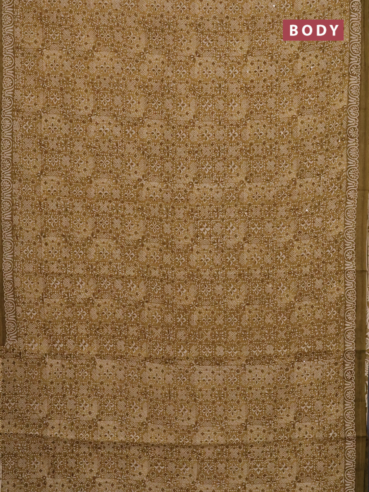 Chanderi silk cotton saree mustard green with allover prints & mirror work and printed border