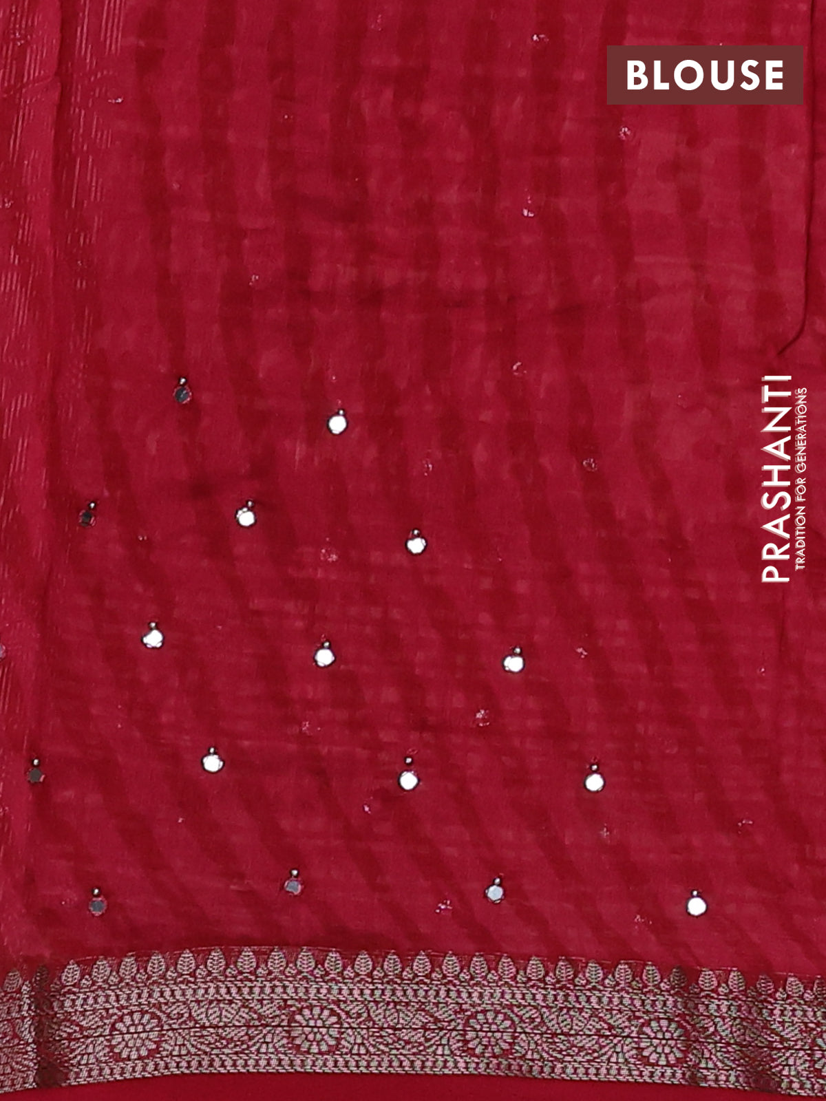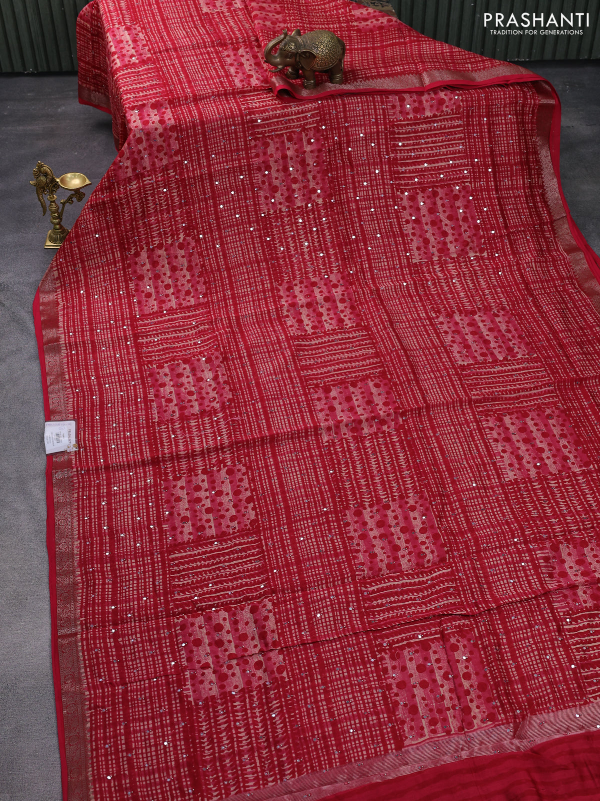Chanderi silk cotton saree red with allover geometric prints & mirror work and woven border