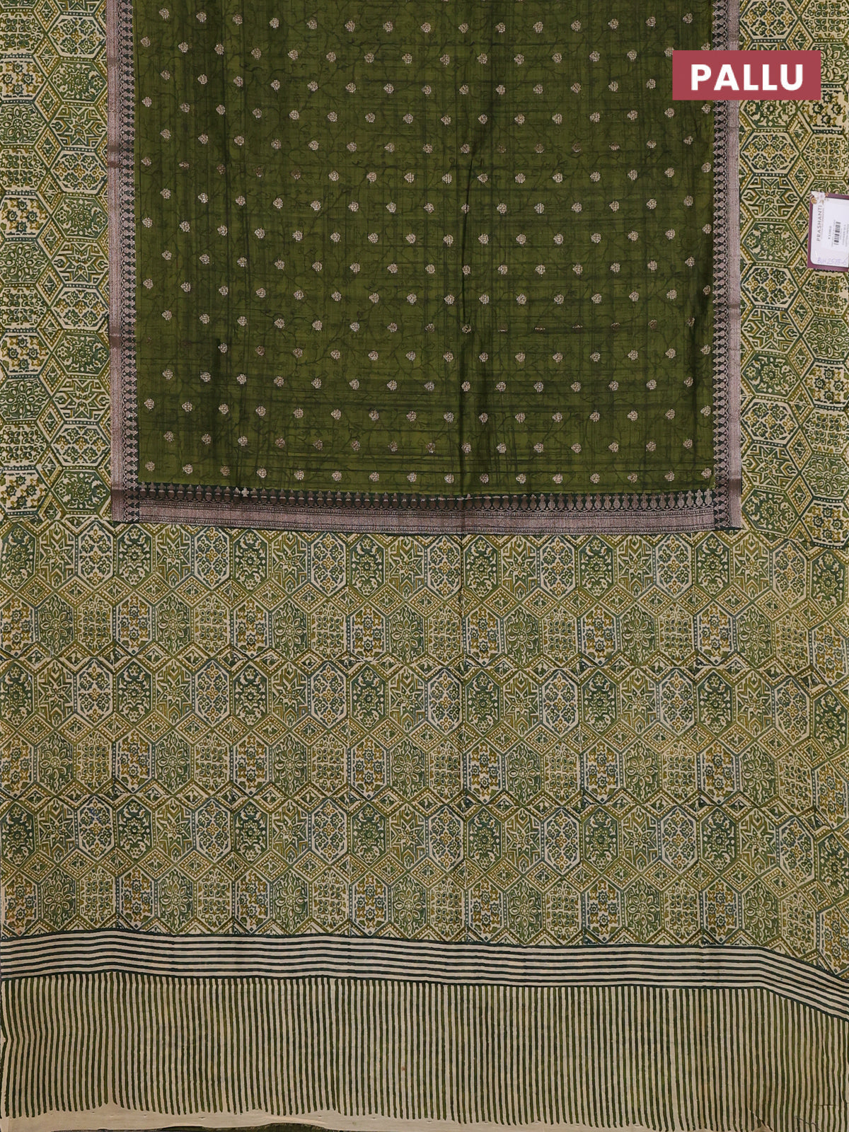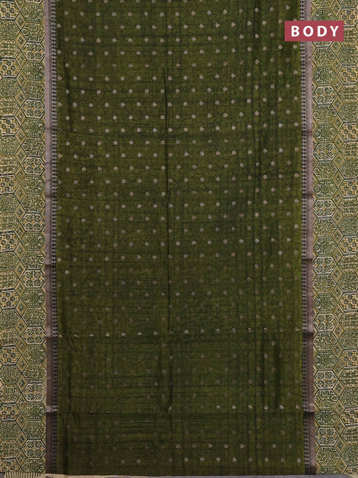 Chanderi silk cotton saree sap green and beige with allover zari buttas and printed border