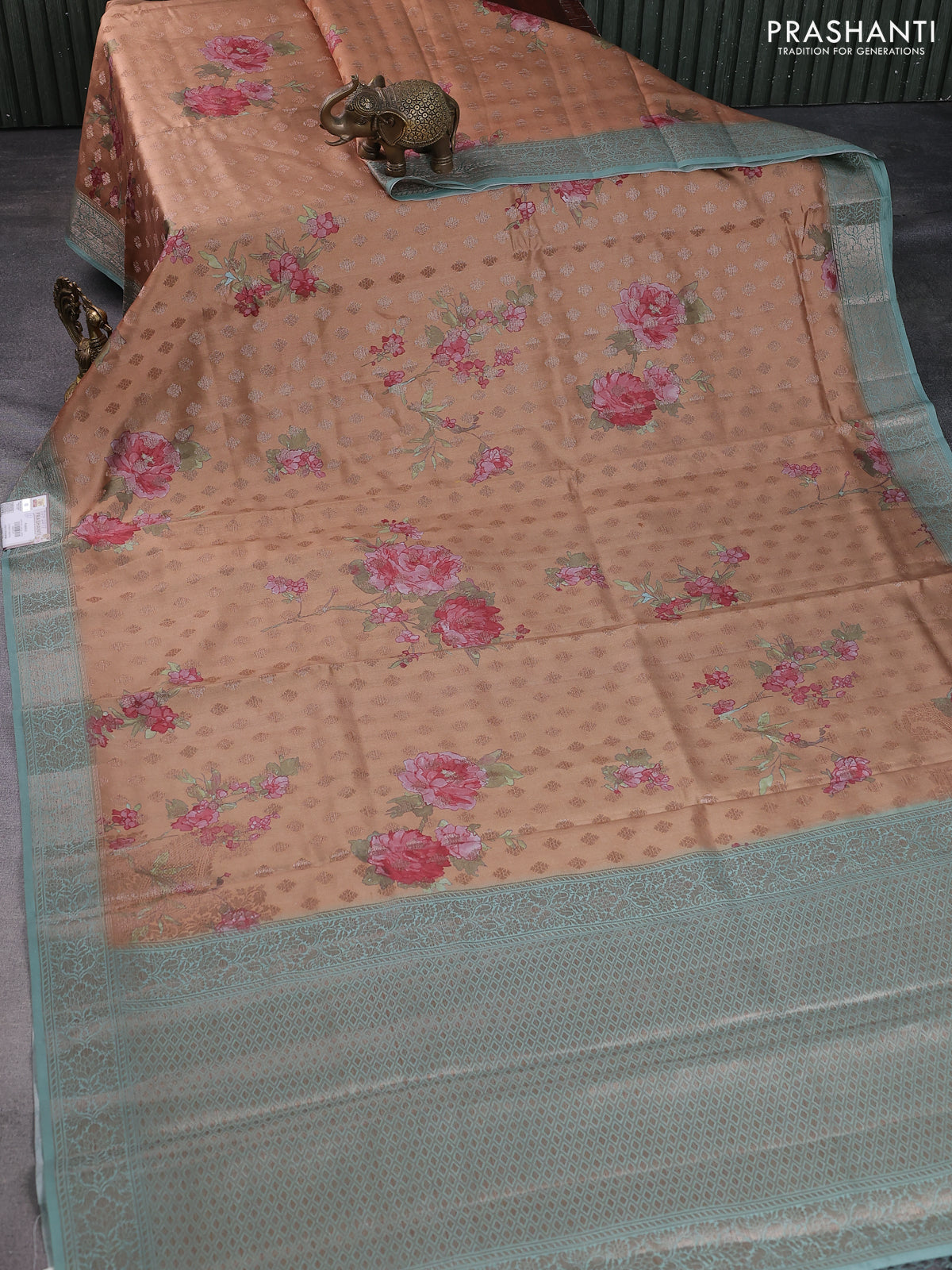 Chiniya silk saree dark sandal and pastel blue with woven buttas & digital prints and zari woven border