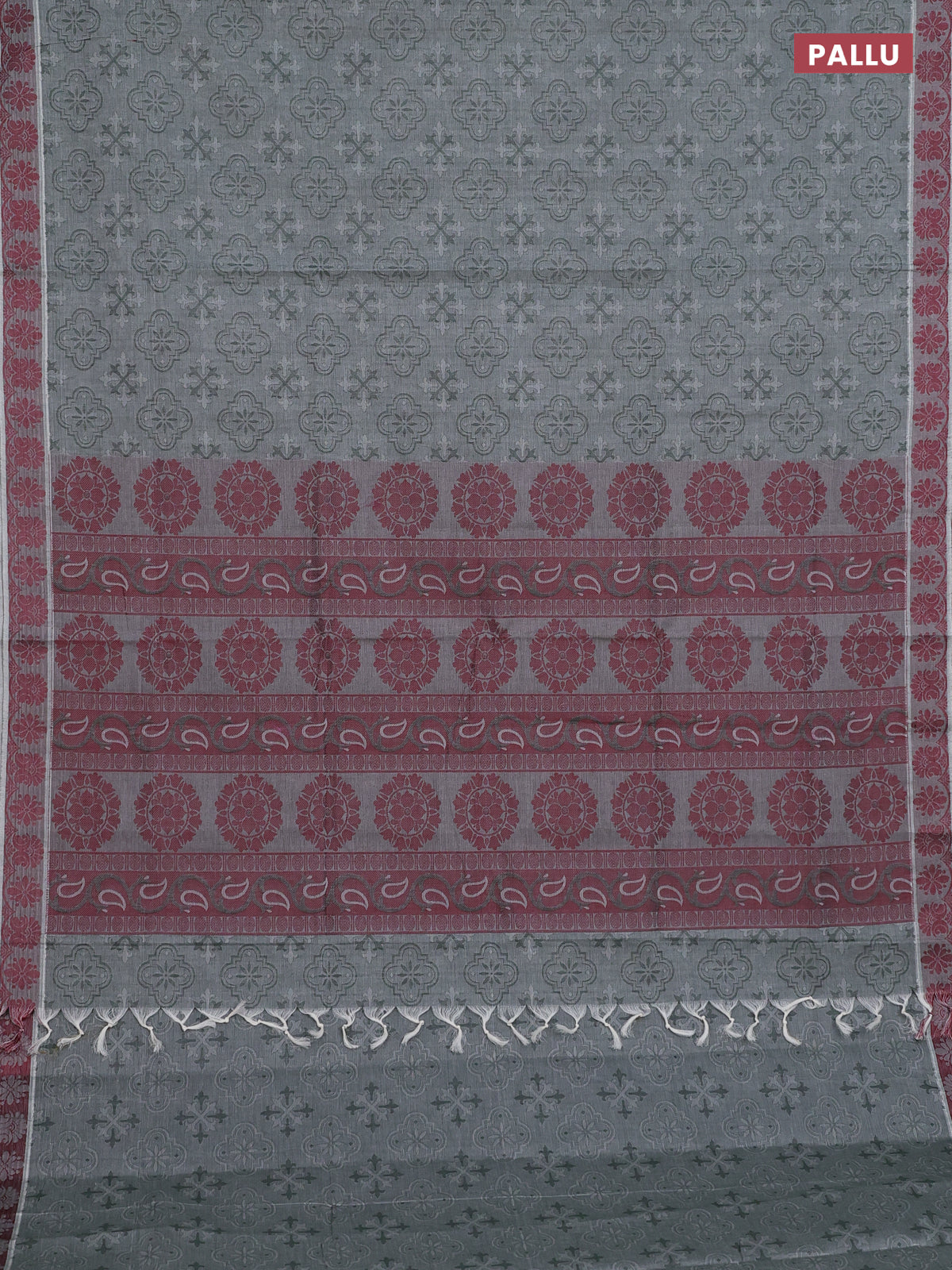 Coimbatore cotton saree greyish green and maroon with allover self emboss and thread woven border