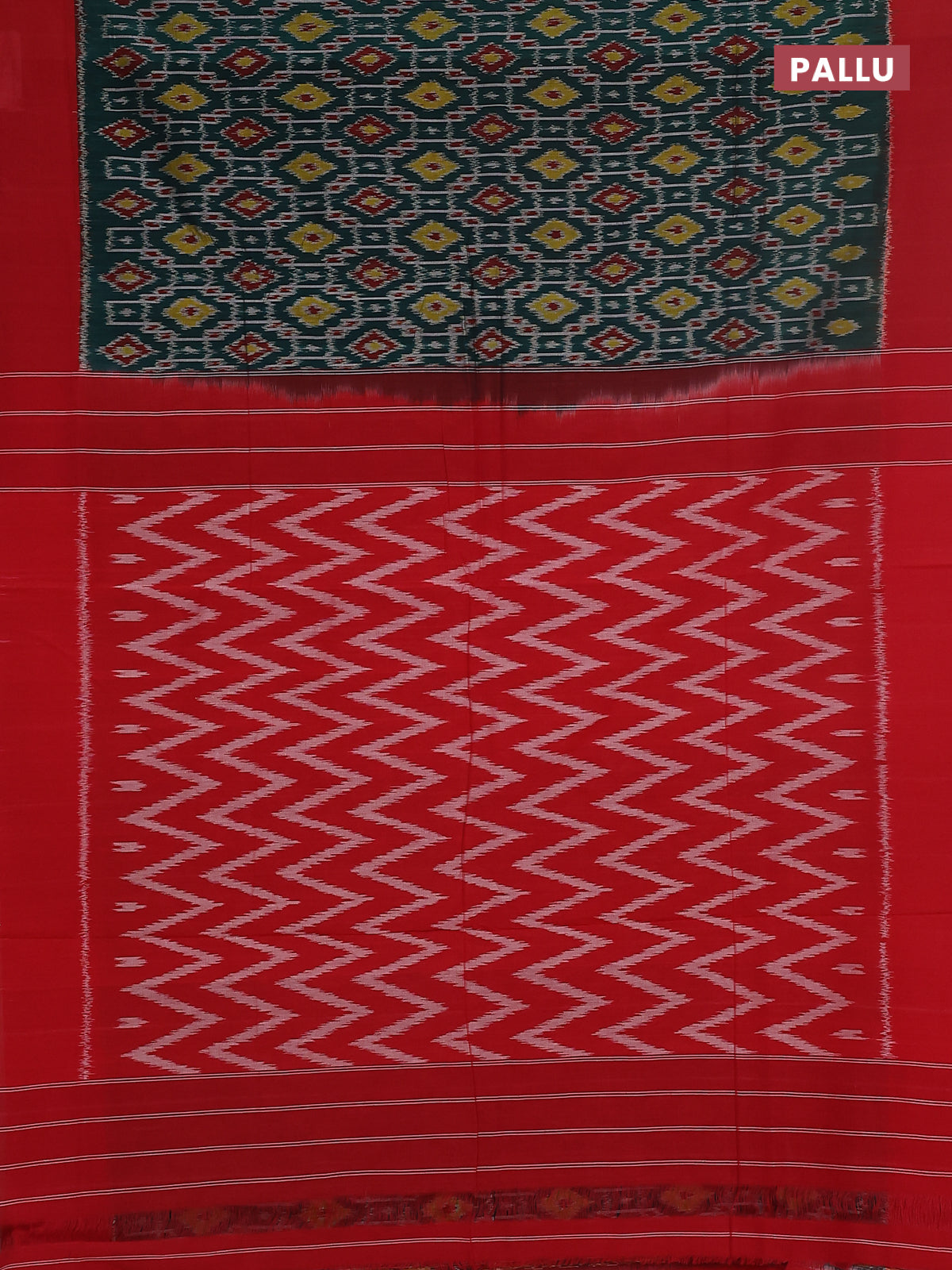 Ikat cotton saree dark green and red with allover ikat weaves and simple border