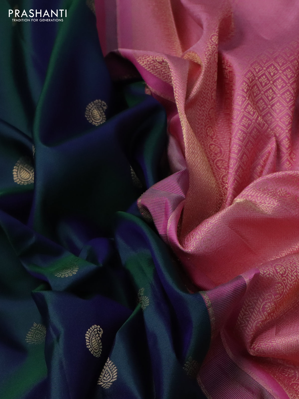 Pure gadwal silk saree dual shade of bluish green and light pink with paisley zari woven buttas and temple design zari woven border