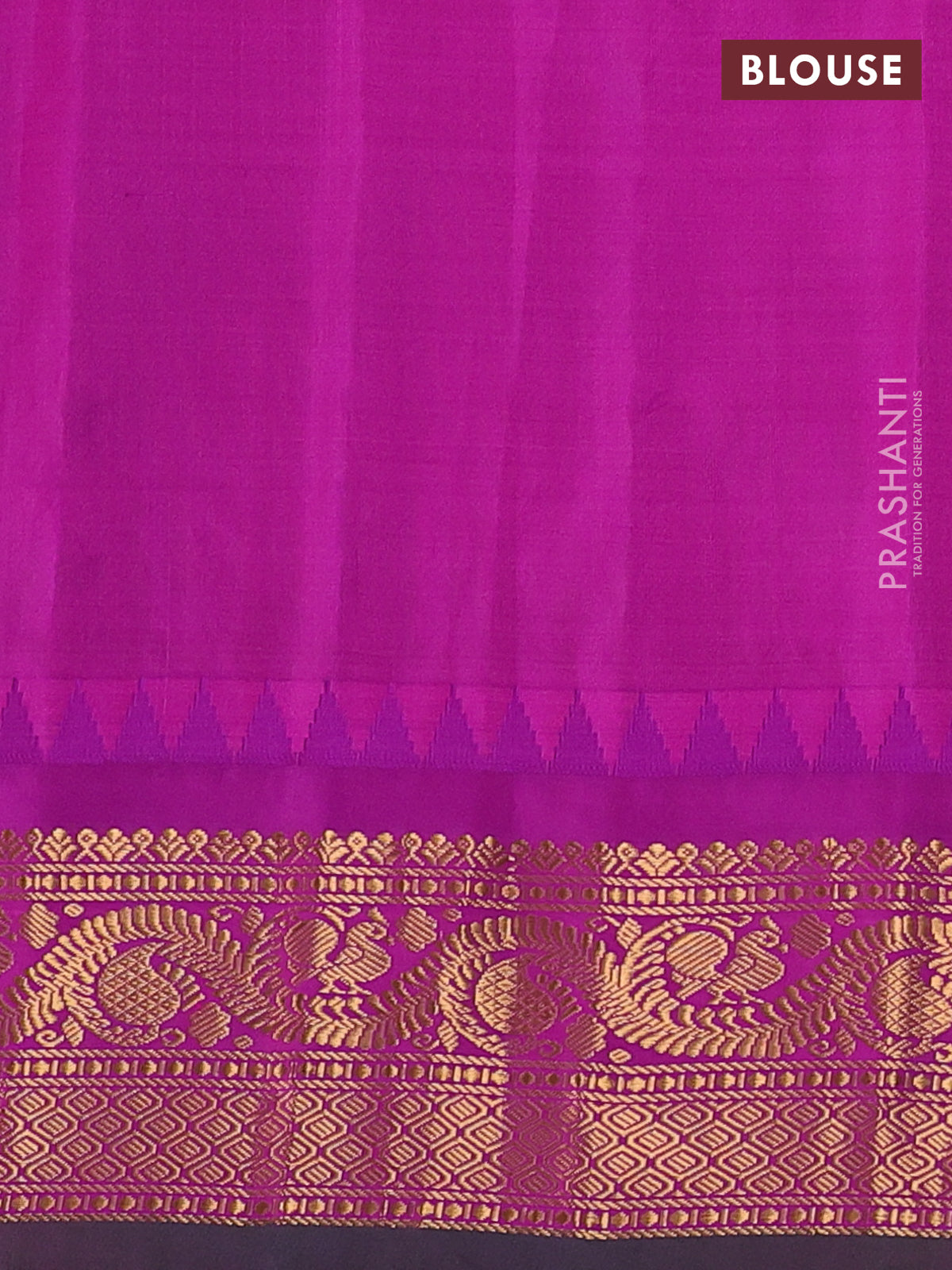 Pure gadwal silk saree green and purple with allover zari woven buttas and temple design zari woven border