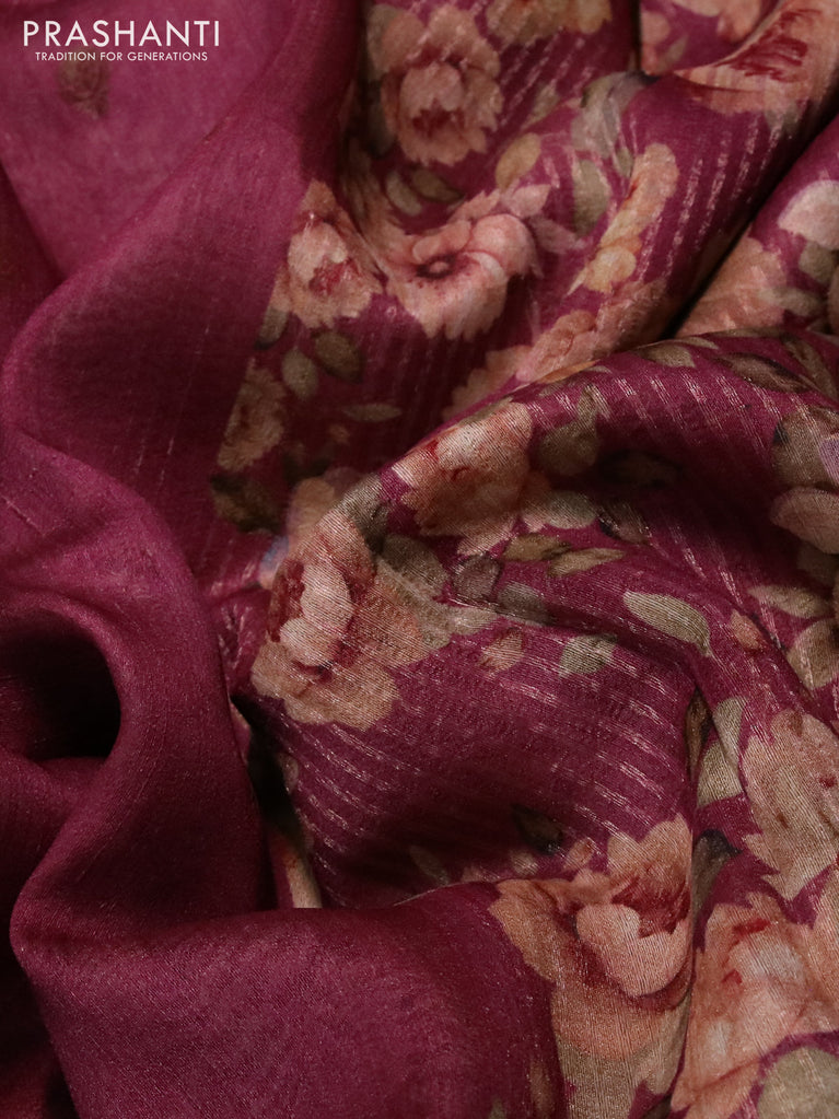 Banarasi tussar silk saree maroon and magenta pink with zari woven buttas and zari woven floral digital printed border