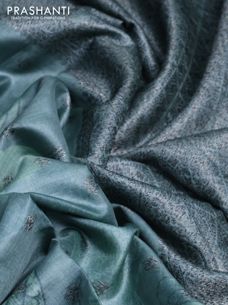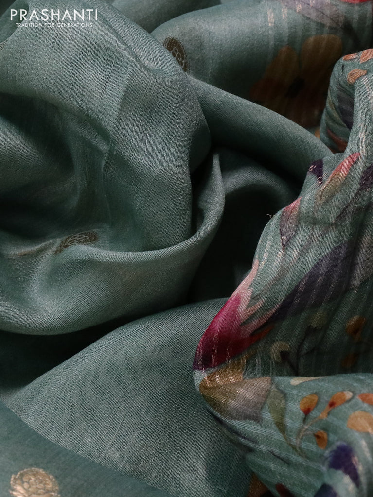 Banarasi tussar silk saree green with woven buttas & floral digital prints and piping border