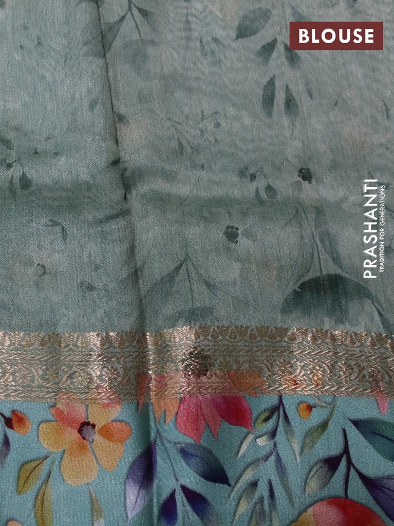 Banarasi tussar silk saree pastel blue shade with woven buttas & floral digital prints in borderless style
