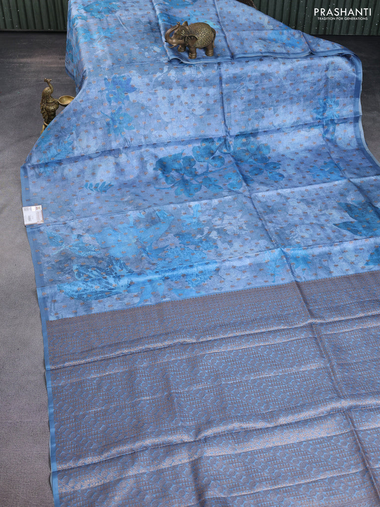 Banarasi tussar silk saree blue with woven buttas & floral digital prints and piping border