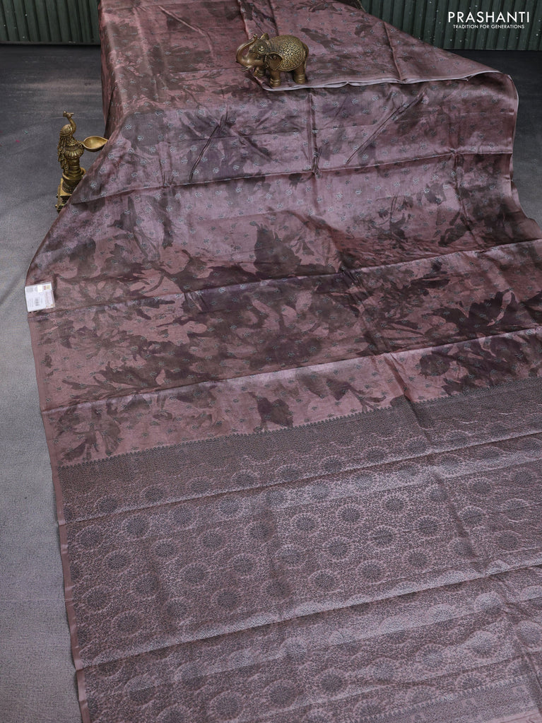 Banarasi tussar silk saree brown shade with woven buttas & digital prints in borderless style
